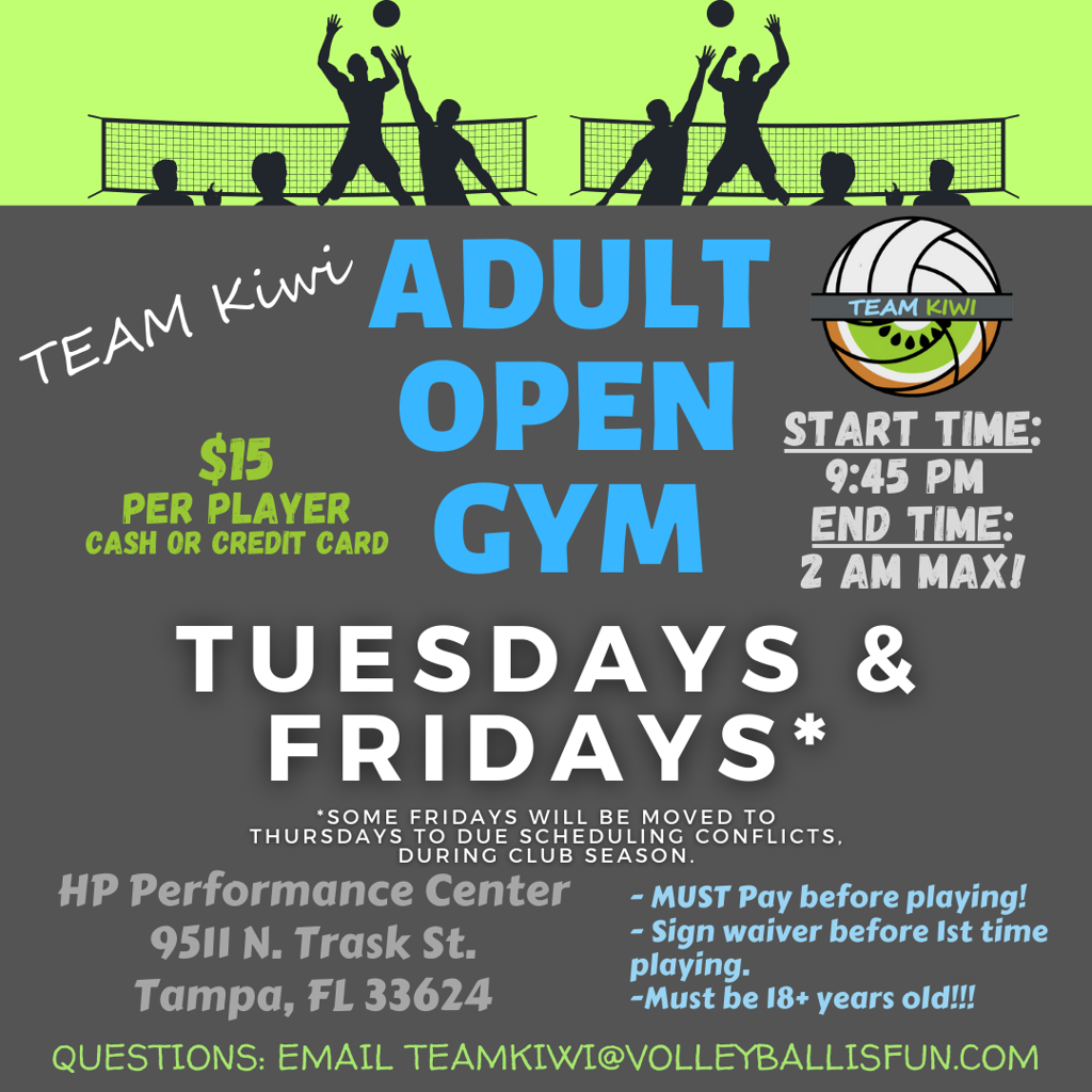 TEAM KIWI offers multiple nights of Adult Volleyball. Every Tuesday and Friday we have adult open gyms - no need to register, just come on out. It's only $15 at the door.